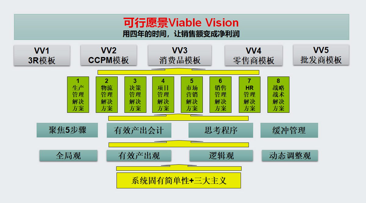 TOC理论体系的可行愿景—用四年时间让销售额变成净利润!TOC理论的一个基础假设是现实是简单而又和谐的,关注系统固有的简单性和三大主义,从全局观、有效产出观、逻辑观、动态调整观深入到生产管理中,通过聚焦五步骤、有效产出会计,思考程序和缓冲管理,逐步实现可行愿景。