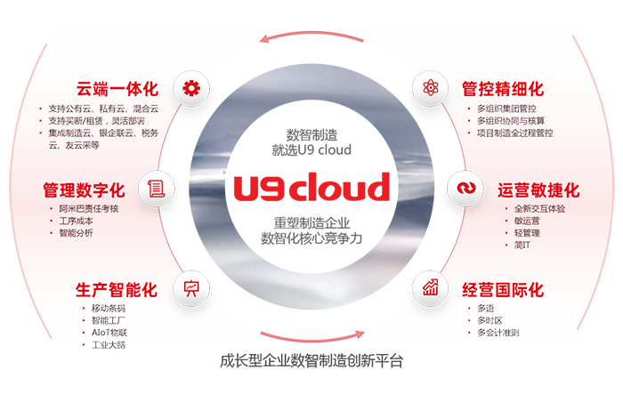 用友 U9 cloud 是一款面向成长型企业的数智制造创新平台,作为用友精智工业互联网平台的重要组成部分,全面运用移动互联网、大数据、物联网、人工智能等最新技术,融合 PLM、智能工厂、AIoT、制造云、营销云、采购云、财务云、税务云、人力云等服务,构建互联互通的智能制造体系,真正帮助企业实现设计制造一体化、计划执行一体化、项目制造一体化、制造服务一体化、经营核算精细化,为成长型企业打造一站式数智化升级方案,重塑制造企业数智化核心竞争力。